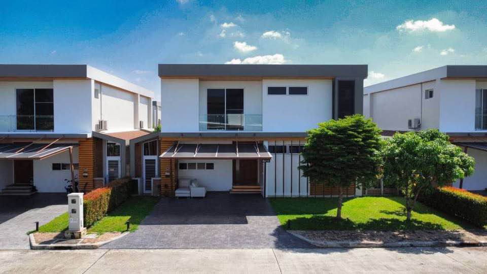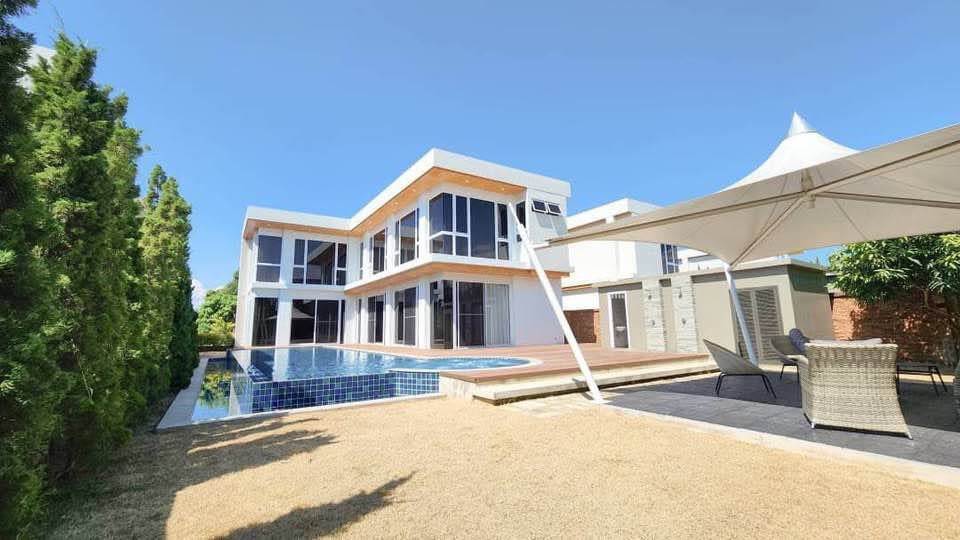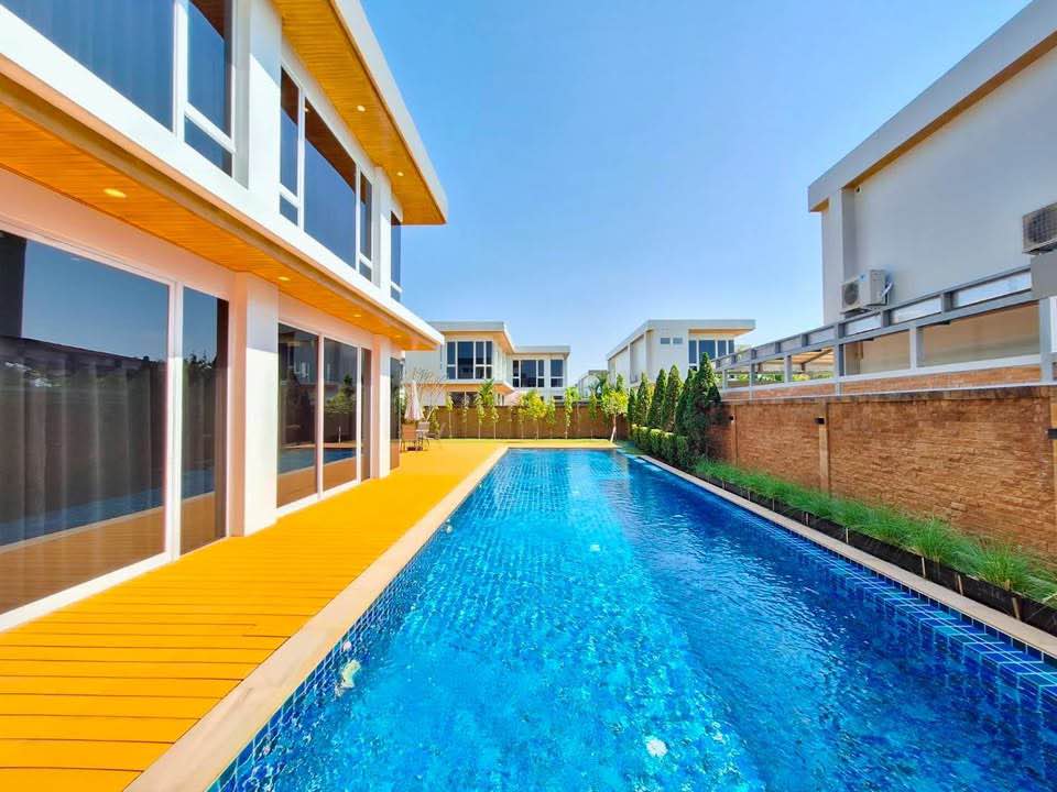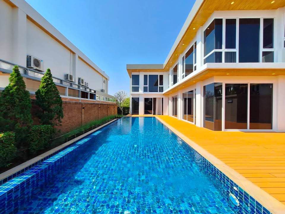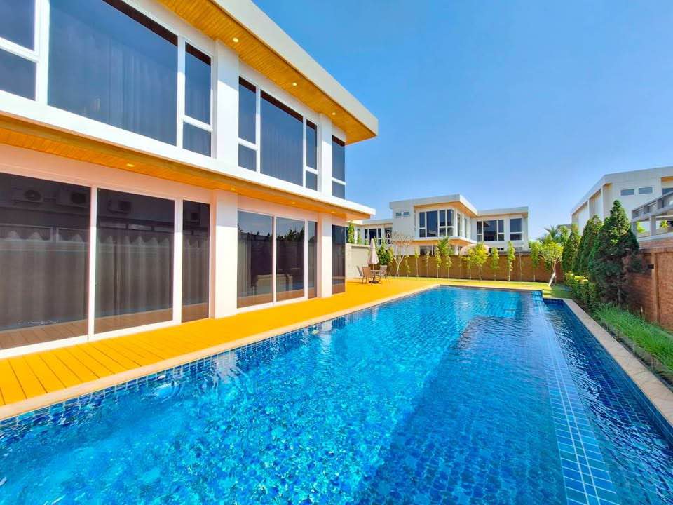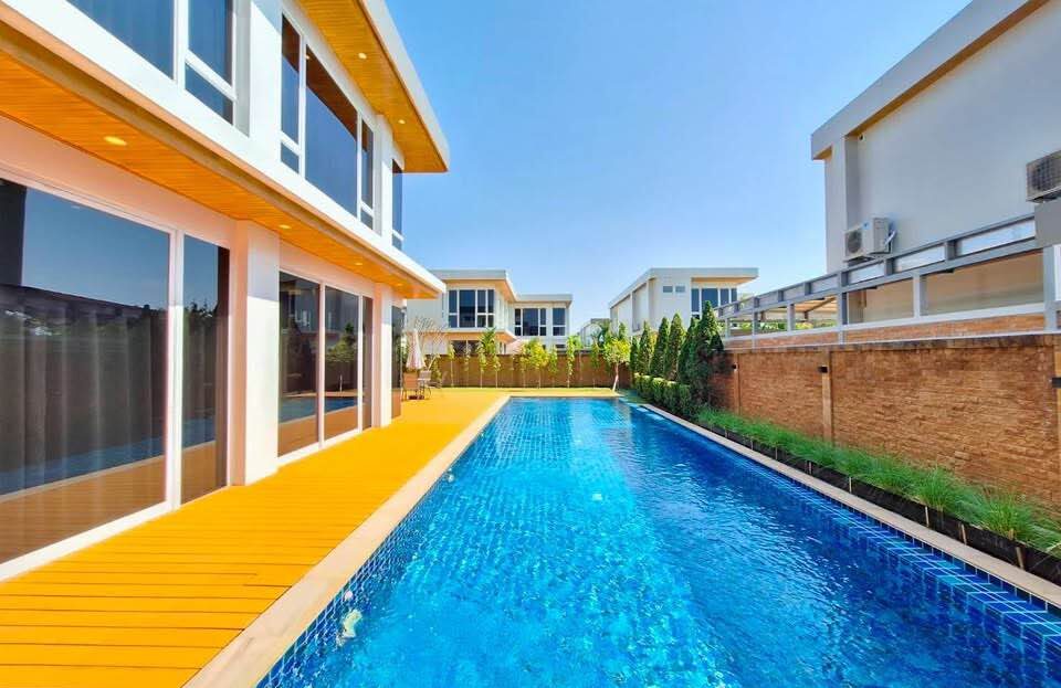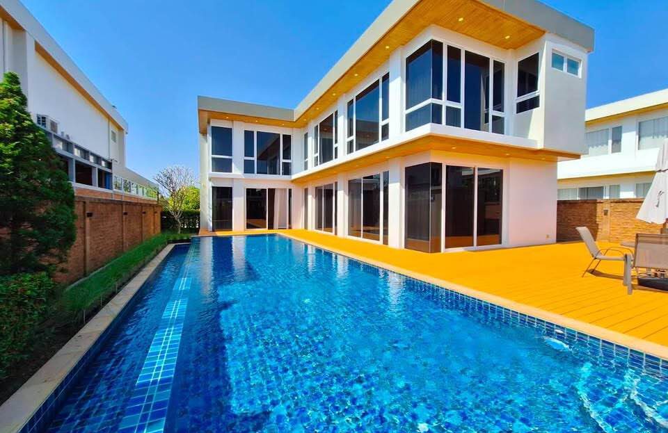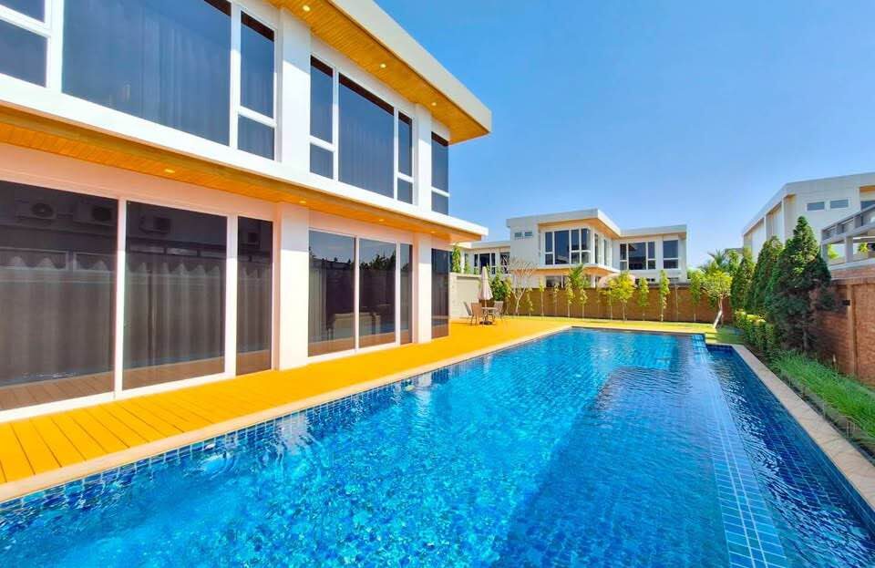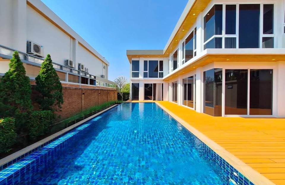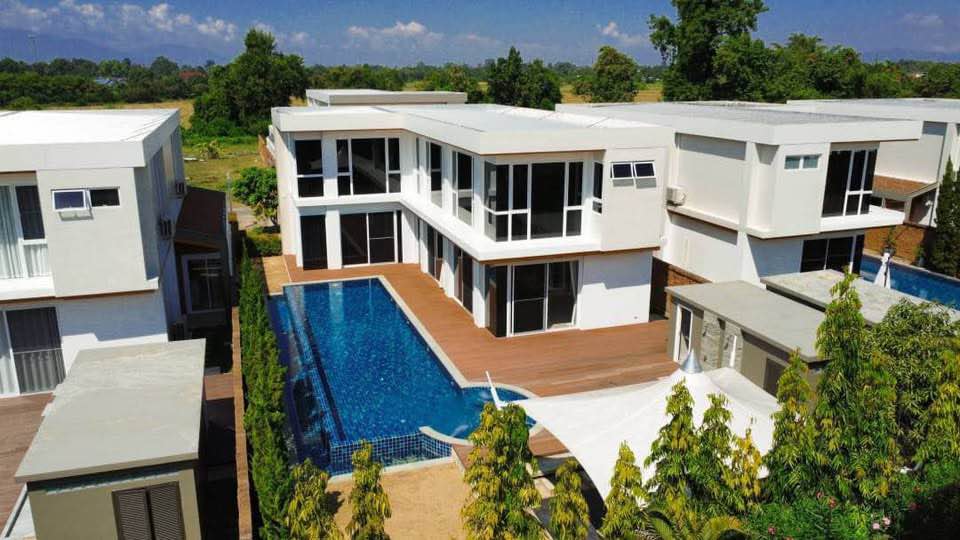 Modern pool villas for rent on Old Sankampaeng Road, Chiang Mai. Three 4-bedroom homes available, each featuring a 4 x 15 m saltwater pool with jacuzzi, 285 sq m of living space, and a fully fitted built-in kitchen. Ideal for families; pets considered with an additional deposit.