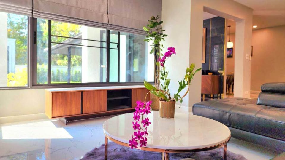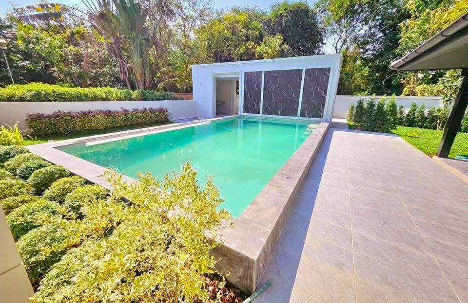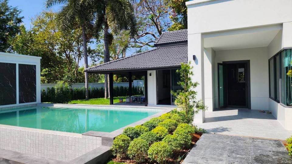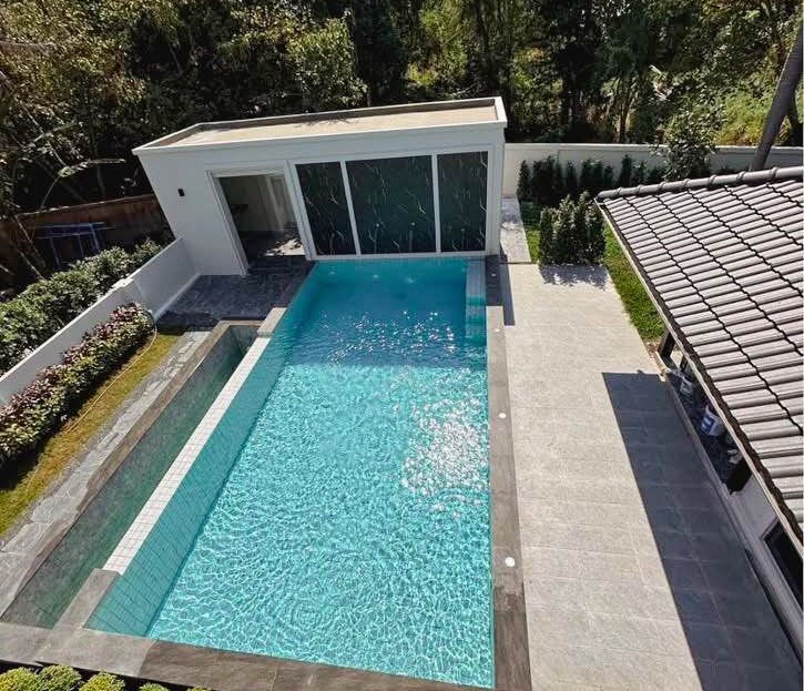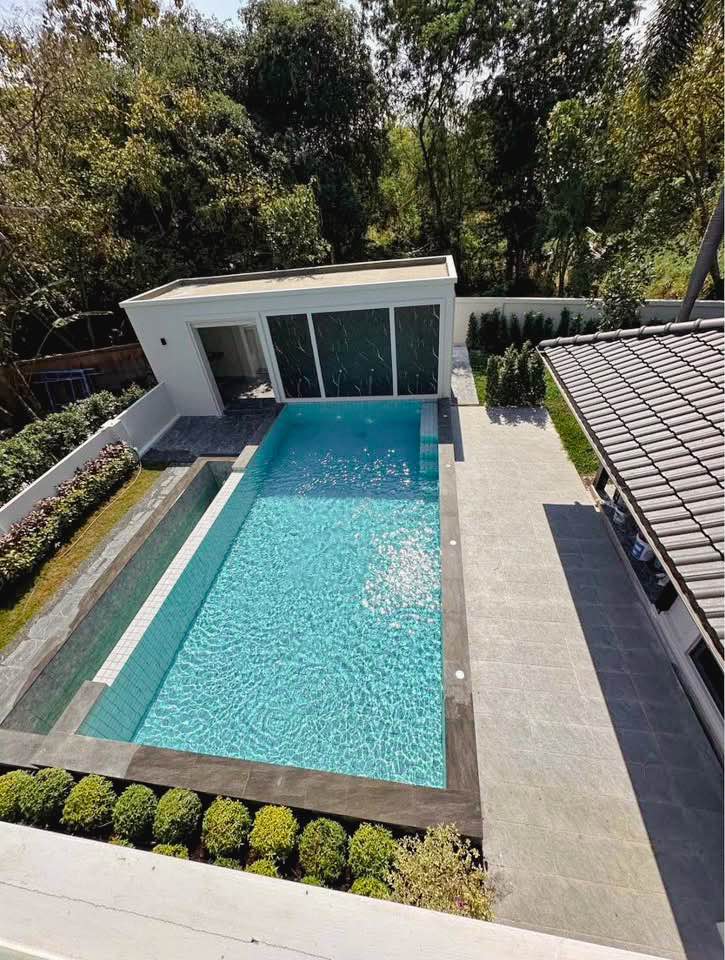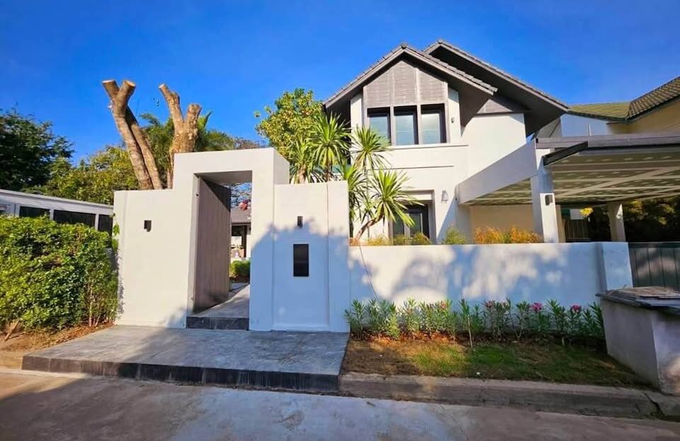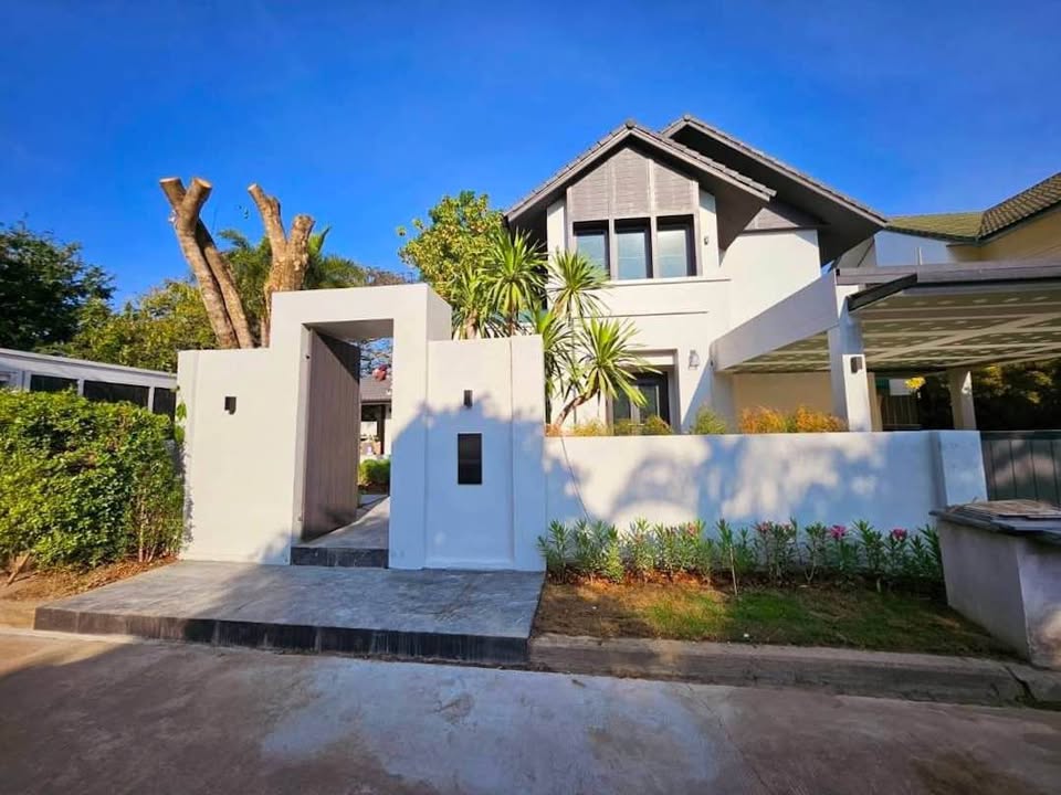 A spacious family pool villa in the Lanna Pinery Home gated community, Hang Dong. Offering 480 sq.m of usable space on a 143 sq.wah (approx. 572 sq.m) plot, this 5-bedroom, 7-bathroom home features an 8 x 4 m saltwater pool, an outdoor entertaining area, a full kitchen with pantry, dedicated dining and living rooms, and a maid’s room. Residents enjoy excellent communal facilities including a playground, swimming pool, tennis court, and security.