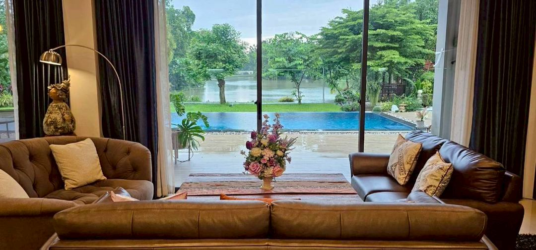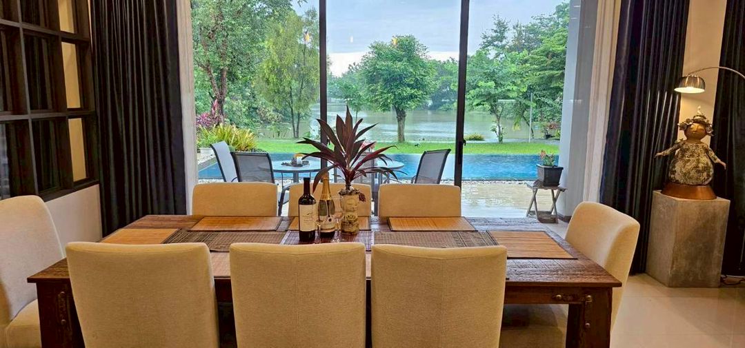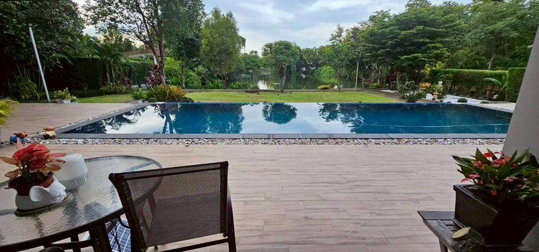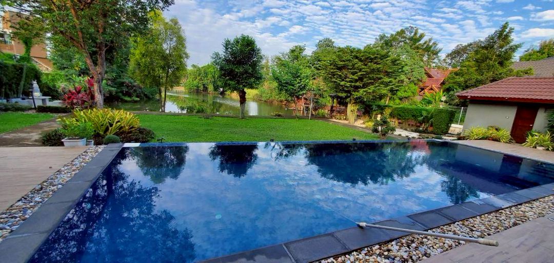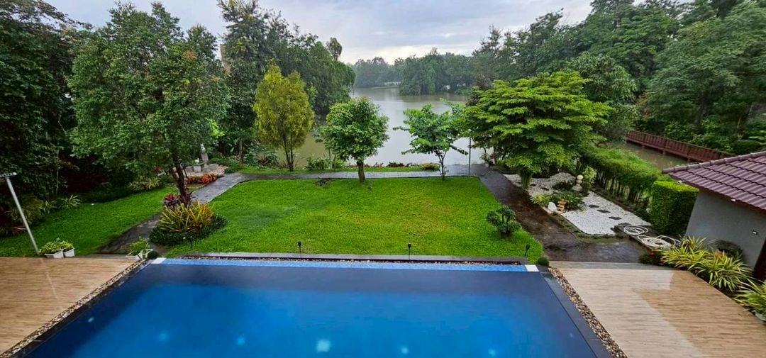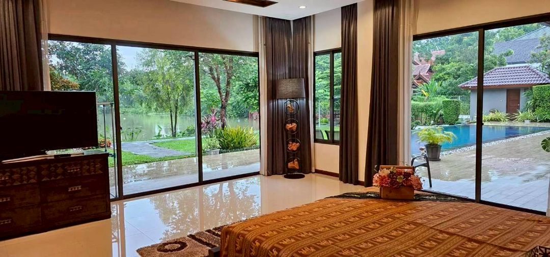 A stunning two-story villa in modern Lanna style, located in Wang Tan Village, surrounded by lush greenery and a beautiful lake. The village offers a pleasant, cool climate and excellent privacy, while being conveniently close to the city center.