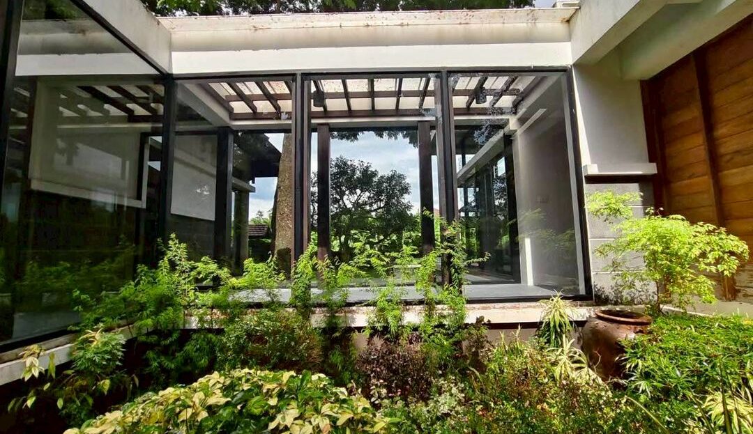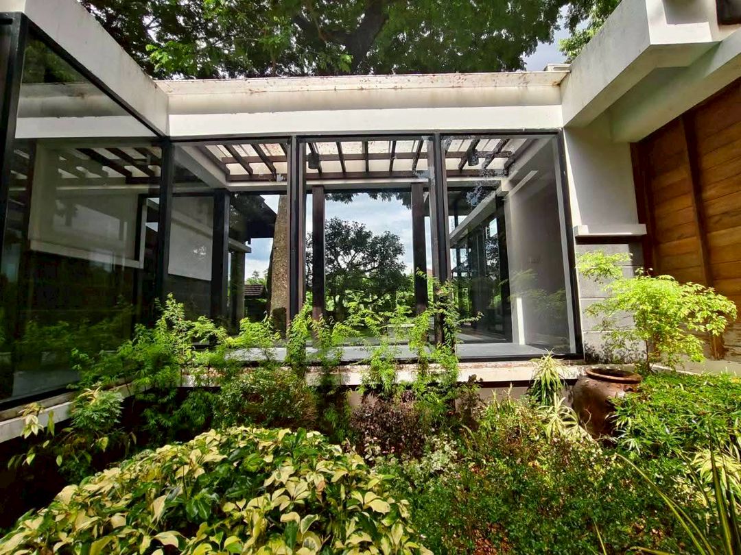ทางเดินกระจกเชื่อมบ้านสองหลัง ล้อมรอบด้วยบรรยากาศสวนทั้งสองด้าน
