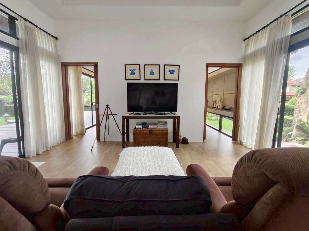 ห้องรับแขก/พักผ่อนขนาดใหญ่ โปร่ง โล่ง และมองเห็นวิวสวน